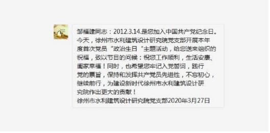 三是開展“過政治生日,強初心使命”活動。我院共有五名黨員入黨周年紀念日在一季度,院支部通過向五位同志發送祝福短信、支委頒發政治生日賀卡等活動,鼓勵他們能夠“不忘初心,牢記使命”,為設計院、為徐州水利水務事業做出更大的貢獻。另外,我院全體黨員面對黨旗進行了入黨宣誓,期待在新的一年能取得更大的進步。