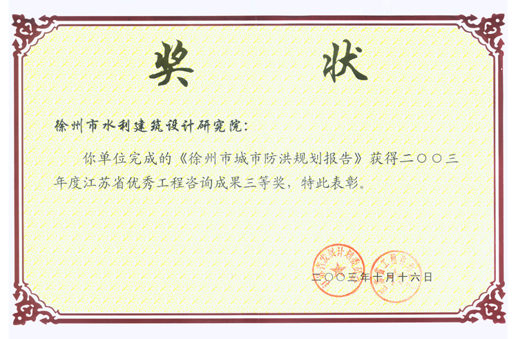 《市城市防洪規劃報告》咨詢三等獎(2003)